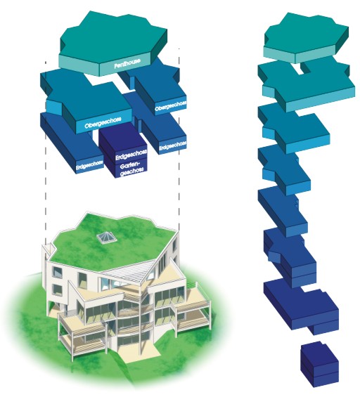 Das Spektrum der Möglichkeiten umfaßt eingeschossige Wohnungen im Erdgeschoss mit familiengerechter Gartennutzung, Obergeschoss-appartements mit Balkonen und Loggien bis hin zum Penthouse mit Panoramaterrasse.